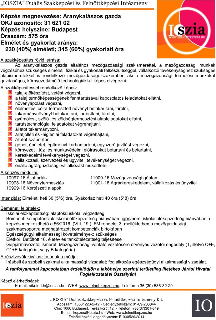 Szerezzen Államilag elismert végzettséget! Jelentkezz most aranykalászos gazdának!